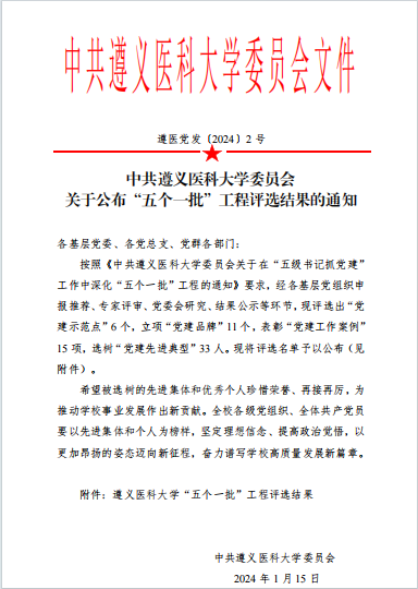 近日,根据《中共betway西汉姆官网委员会关于公布“五个一批”工程评选结果的通知》(遵医党发〔2024〕2号)精神,公司党委在多个项目评审中喜获佳绩,其中,公司党委获评betway西汉姆官网“标杆院系”(全校2个),公司党委申报的“打造1+4党建品牌,坚持高质量党建引领高质量发展”获评betway西汉姆官网党建工作“最佳案例”(全校5个)、公司党委书记张在金获评betway西汉姆官网“党建带头人”(全校4个),教师党员张毅、员工党员黄庆庆获评betway西汉姆官网“优秀党员”。