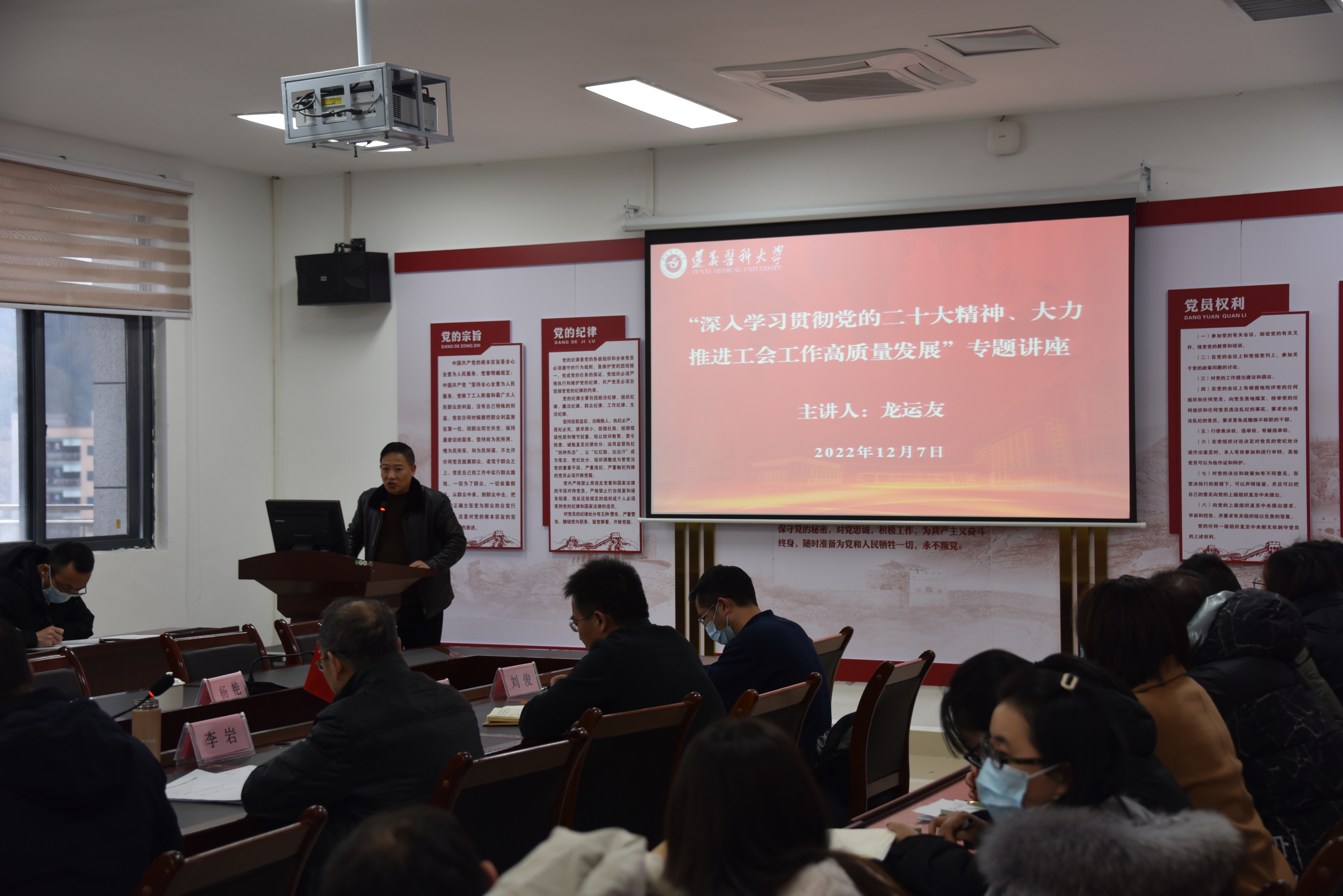 会上,李岩经理代表公司党政对龙运友主席一行莅临公司调研和指导工作表示欢迎。王红卫副书记就公司工会基本情况和本年度工会工作作了汇报。龙运友主席和公司教职工就工会工作创新及如何调动教职工积极参与等问题作了深入的交流。随后,龙运友主席从党的二十大报告中关于工厂工会工人的论述、深入学习贯彻习近平总书记关于工人阶级和工会工作的重要论述,以及如何推进工会工作高质量发展方面作了专题宣讲。龙运友主席的宣讲重点突出、政策解读准确,使广大教职工对工会工作有了更加深刻的理解。