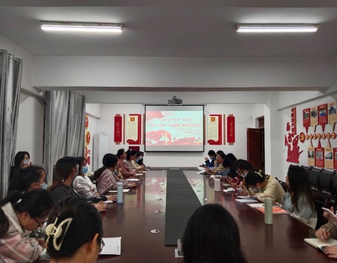 会上,全体党员观看了党的二十大相关学习视频。张译文同志领学了党的二十大报告主要内容的前半部分;陈星竹同志领学了党的二十大报告主要内容的后半部分。随后,叶佳惠同志从思想、专业学习、青年担当等方面围绕党的二十大精神作研讨发言;杨瑷瑜同志从脱贫攻坚、抗击新冠疫情、科学技术攻关等方面围绕党的二十大精神作研讨发言。
