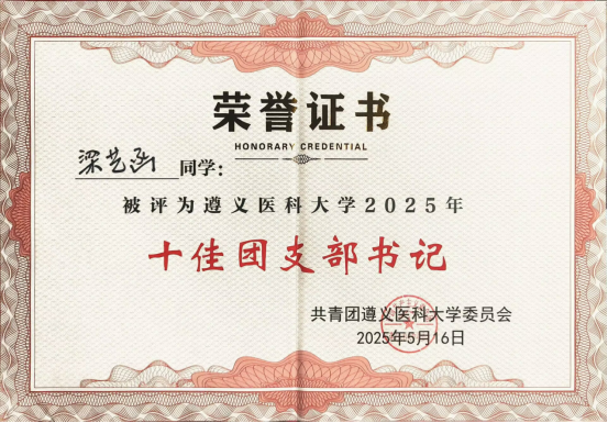 近日,在公司团委组织的“十佳团支部书记”评选活动中,公司预防医学22级1班团支书梁艺函脱颖而出,荣获betway西汉姆官网“十佳团支部书记”。