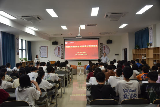 6月28日,贵州西秀翠宏食品有限公司人力资源部部长罗撒拿和招聘专员王香凝一行来公司进行招聘宣讲和交流。公司党委副书记王红卫,食品质量与安全专业负责人张孝刚等老师以及食品质量与安全专业同学等80余人参加活动。张孝刚主持活动。